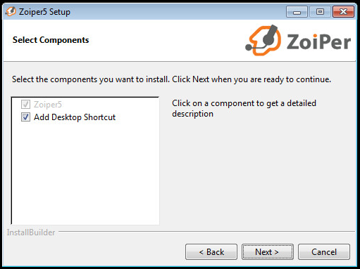 Zoiper se instala por default y dejamos activa la opción de crear un icono en el escritorio, y luego presione “Next”