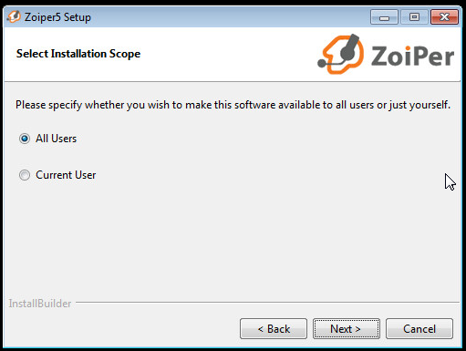Si instala el softphone en un equipo compartido por multiples usuarios lo recomendable es que deje la opción “All Users” si no seleccione “Current User”