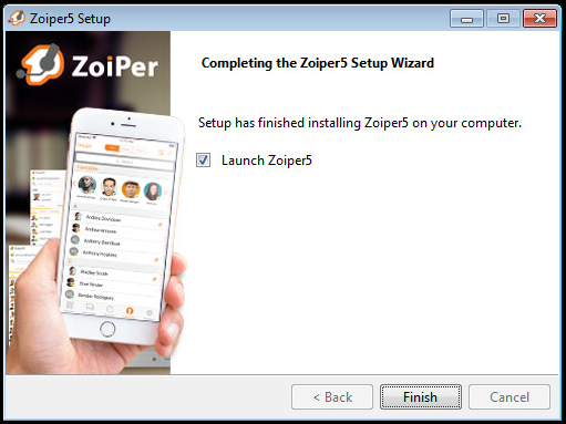 Después de la instalación de archivos, tenemos la opción de ejecutar el softphone, pero desactive la opción “Launch Zoiper5” y presione “Finish”.