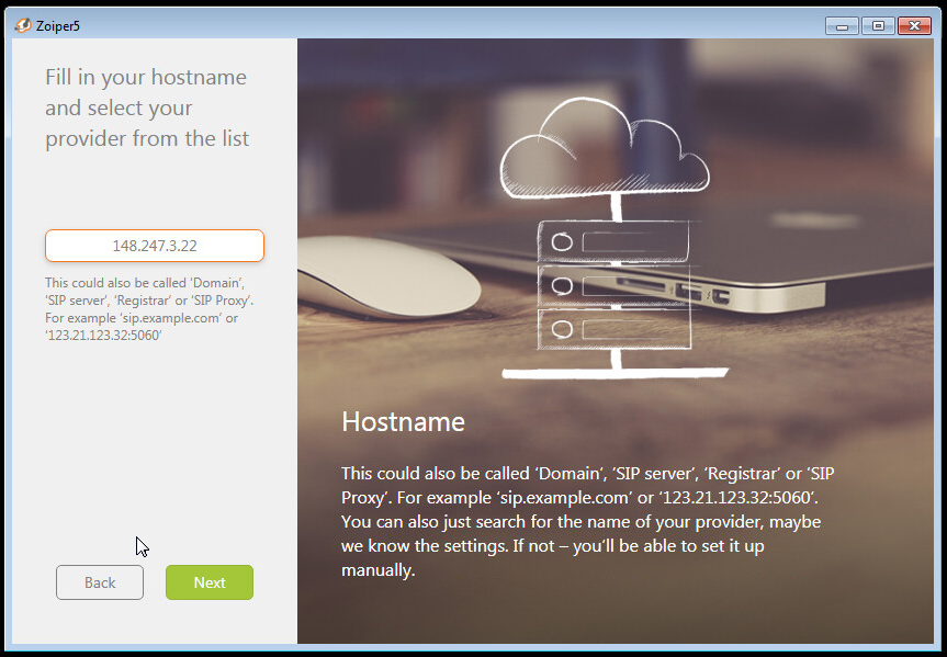 Posteriormente confirmaremos que la dirección IP o nombre de host introducidos en la pantalla previa, esté es nuestro servidor SIP o de telefonía IP, el puerto de conexión al servidor se definirá automáticamente, presione “Next”