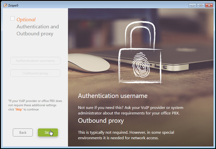 Por lo regular no es necesario definir mayores configuraciones de autenticación al servidor de telefonía IP, por lo que en la pantalla “Authentication and Outbound-proxy”, presione “Skip”