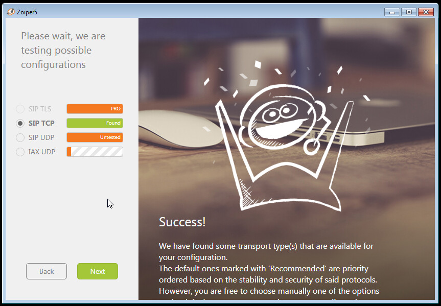 El softphone en este proceso identifica a través de que mecanismos se conectara al servidor de telefonía IP, en nuestro caso usara SIP/TCP, con la prueba exitosa presione “Next”