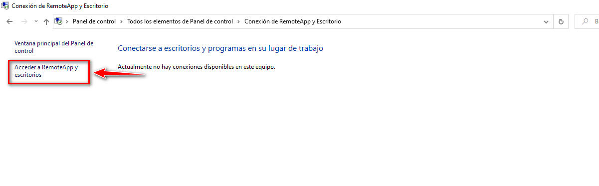 3.- Del lado izquierdo seleccione la opción Acceder a RemoteApp y escritorios.
