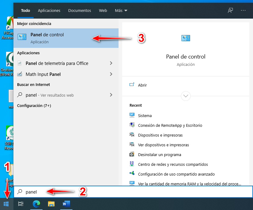 1.- Desde el escritorio presione la tecla de Windows y en la barra de búsqueda teclee la palabra “Control”, ubique la opción Panel de Control y selecciónela con un clic.