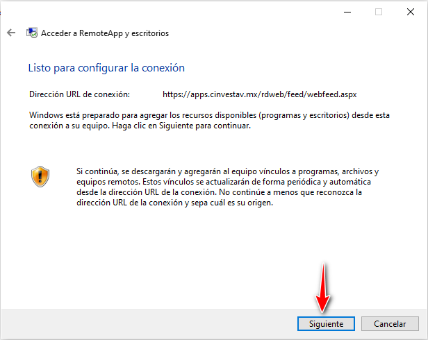 5.- El sistema le mostrara un mensaje informando la configuración de la conexión, de clic en Siguiente para continuar.