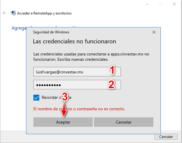 6.- El sistema le solicitara sus credenciales para configurar la conexión, ingrese en el primer campo su dirección de correo electrónico con el formato nombredeusuario@cinvestav.mx, en el segundo campo ingrese su contraseña de correo electrónico, seleccionamos la opción de Recordar Cuenta y presionamos el botón Aceptar.