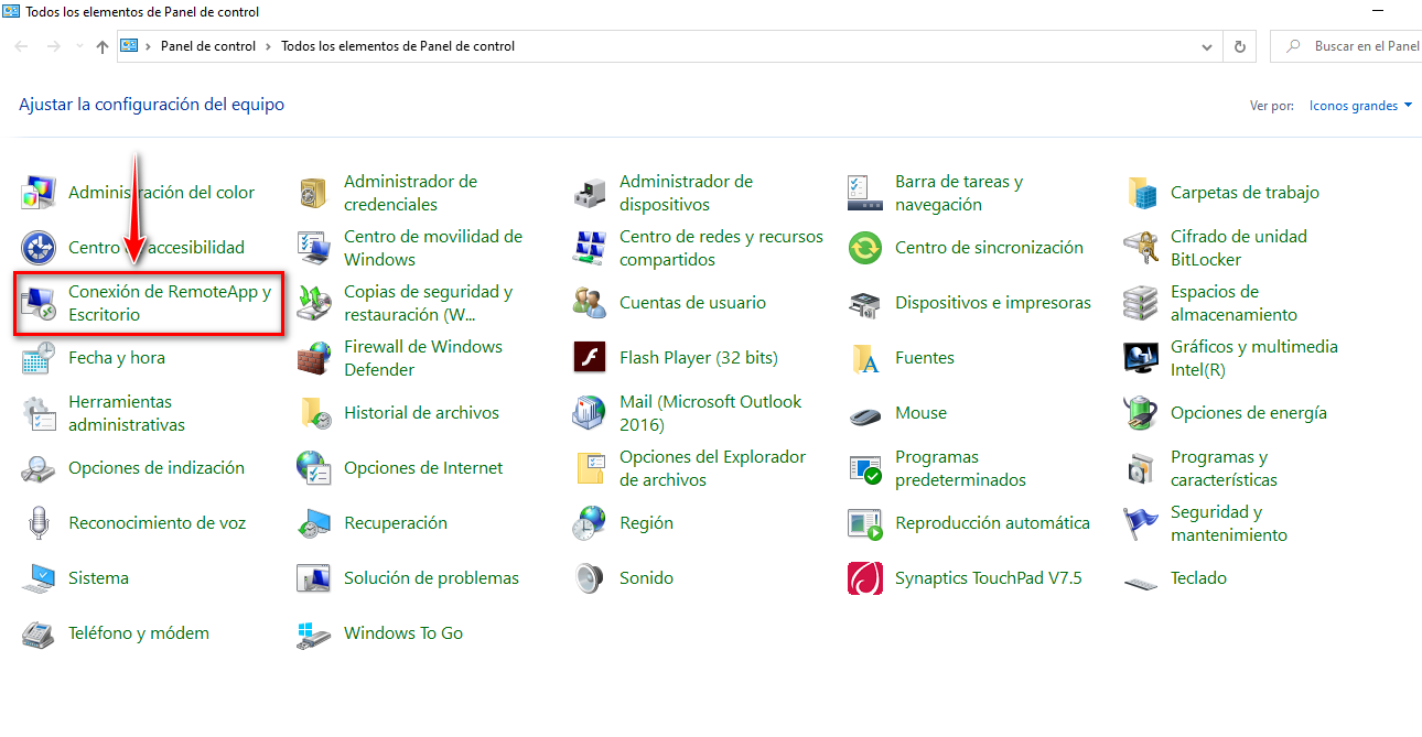 2.- En el menú de Panel de Control ubique la opción Conexión de RemoteApp y Escritorio, selecciónela con doble clic.