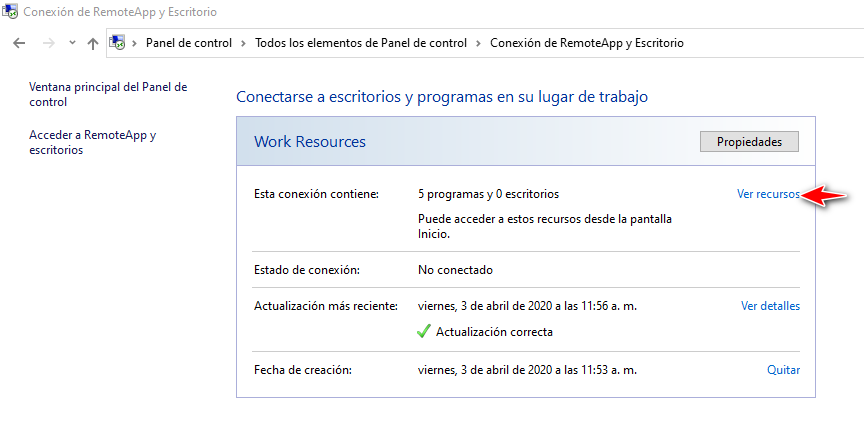 8.- En la ventana de Conexión de RemoteApp y Escritorio mostrará la conexión que se configuro, para ver los accesos directos presionamos en Ver recursos.