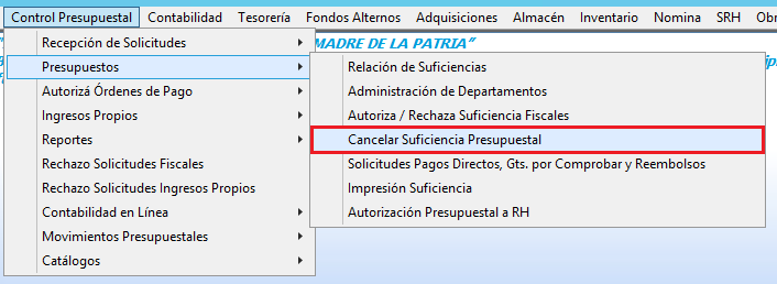 1. Desde el menú principal acceder a la ruta siguiente Control Presupuestal > Presupuestos > Cancelar Suficiencia Presupuestal.