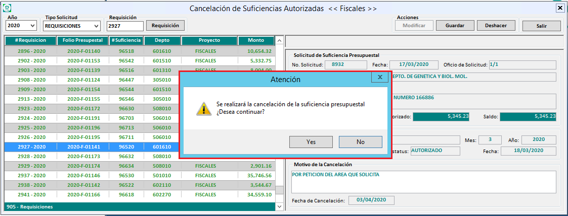 4. Capture el motivo de cancelación y de clic al botón Guardar, se despliega un mensaje donde le pedirá confirmar, continúe el proceso dando clic en Yes (Si) o si desea anular la acción de clic en No.
