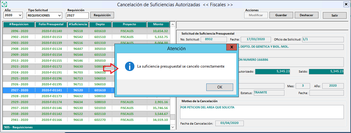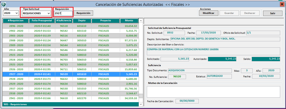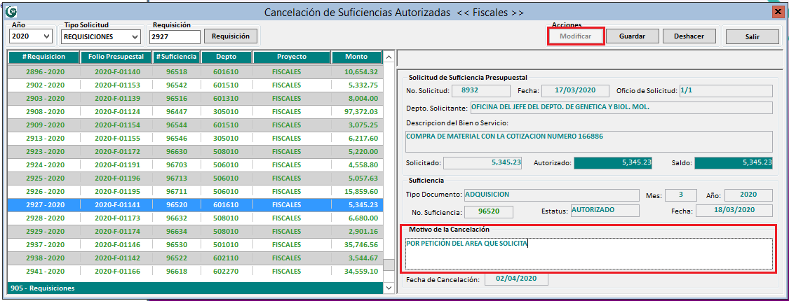 3. Una vez que encontró la solicitud a cancelar, de clic al botón Modificar, vea que se habilita del lado derecho el campo Motivo de la Cancelación, ahí tendrá que capturar el motivo por el cual se está cancelando la suficiencia presupuestal.