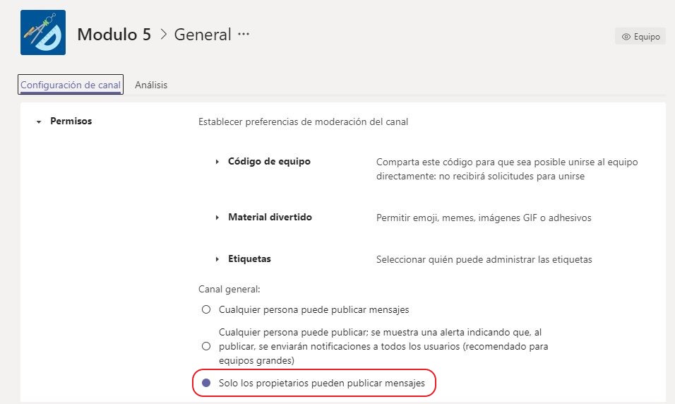 Ahora se establecen los Permisos del Canal General con la opción Solo los propietarios pueden publicar mensajes.