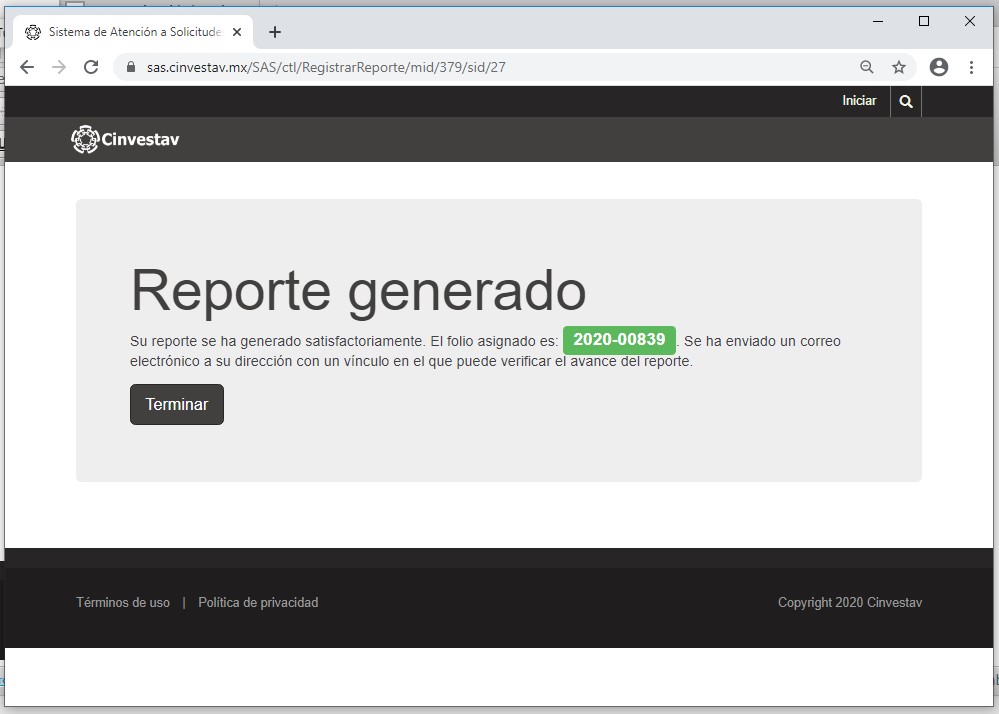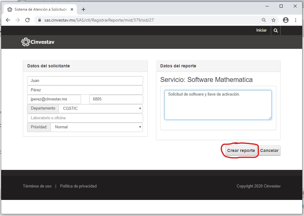 Llenamos con los datos del solicitante y le damos click en Crear reporte.