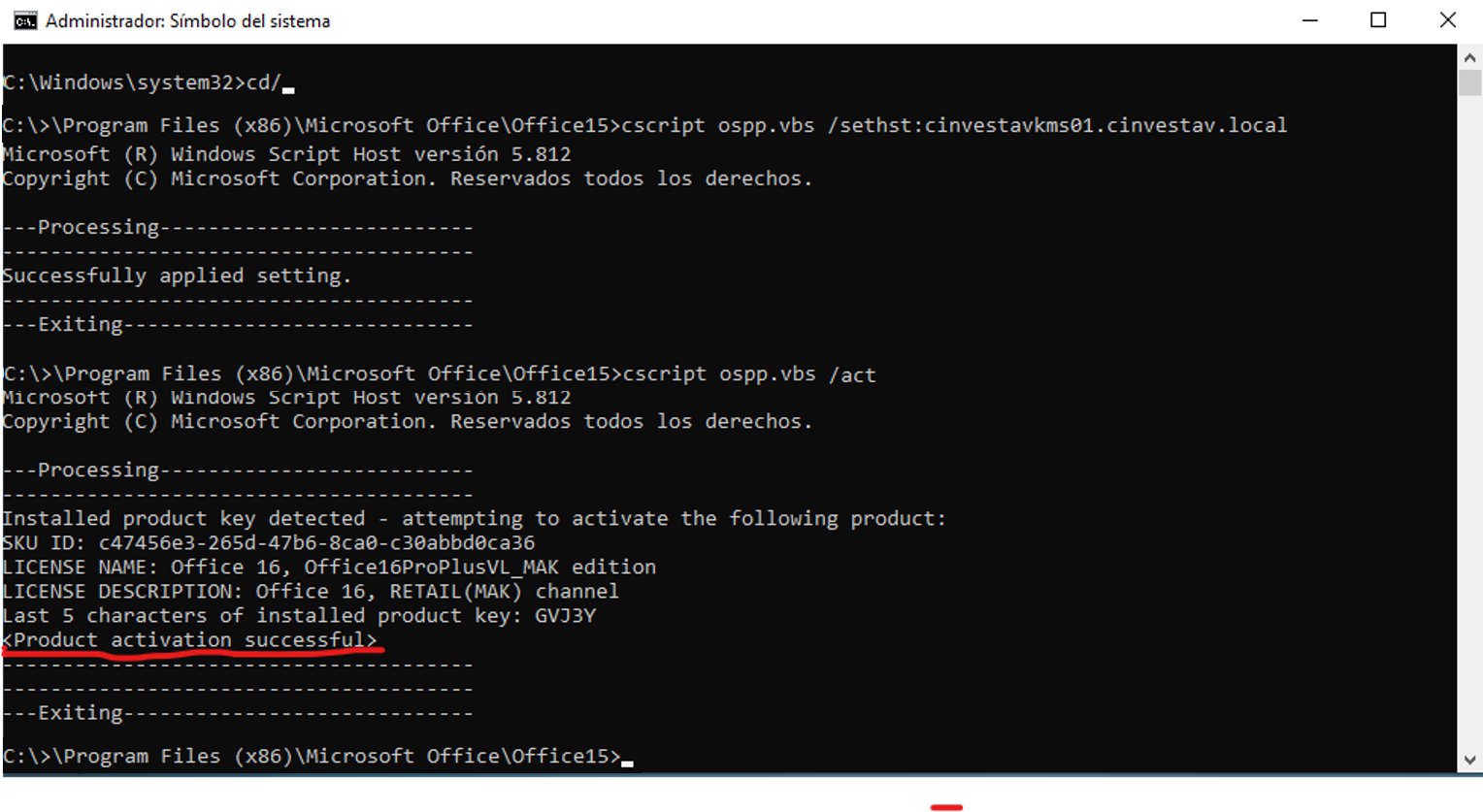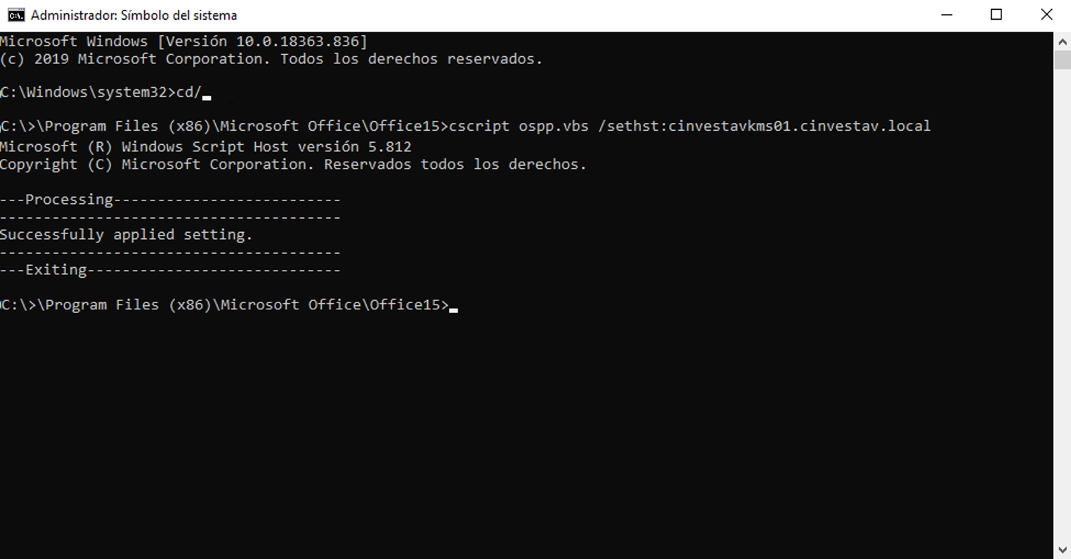 cscript ospp.vbs /sethst:cinvestavkms01.cinvestav.local