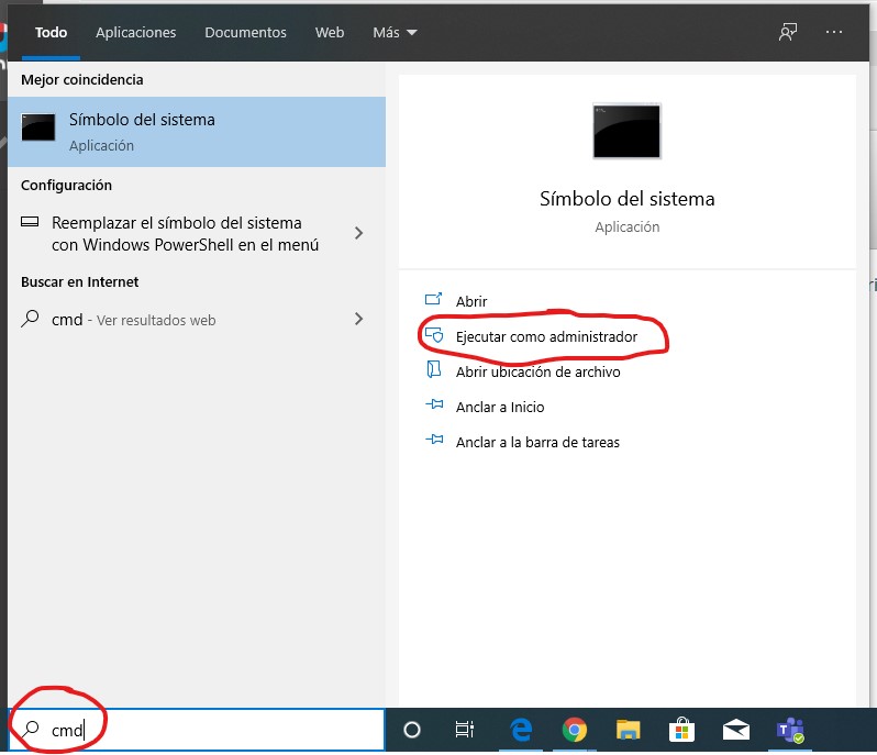 En el buscador escribiremos CMD, cuando nos aparezca lo ejecutaremos como administrador.