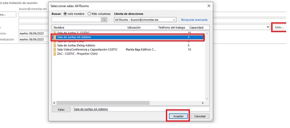 Seleccionar el botón Salas, elegir la sala que de sea apartar oprimir el botón Aceptar.